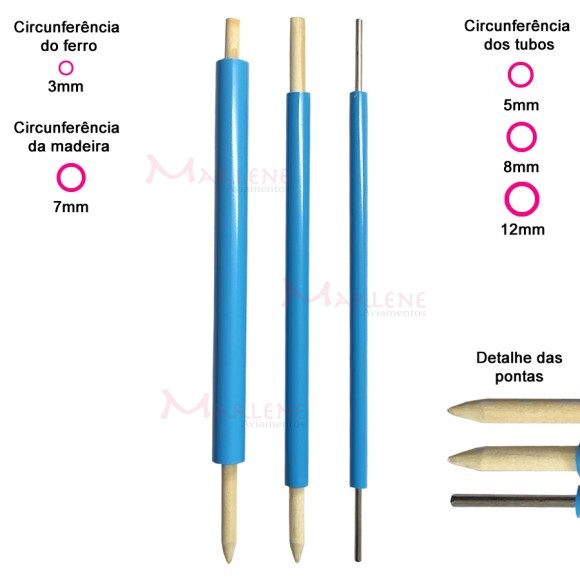 Uso: Usado para virar tecidos de diversos tipos. Para utilizar os tubos, selecione o que for mais compatível com a largura do tecido que deseja virar, ponha o tubo por dentro e com a parte de madeira ou de metal empurre o tecido pelo verso, fazendo com que ele passe por dentro do tubo, para finalizar quando a ponta aparecer do outro lado tudo, é só puxar o tecido.